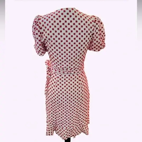 Draper James RSVP wrap embroidered puff sleeve v-neck dress with peplum hem, and fully lined. True wrap dress with attached belt ties, Ruffle trim. 100% cotton Measurements approximately laying flat Chest 15-16 Inches (from pit to pit) Waist 13 Inches (can be adjusted with ties) Lenght 36 Inches Preowned- Great Condition