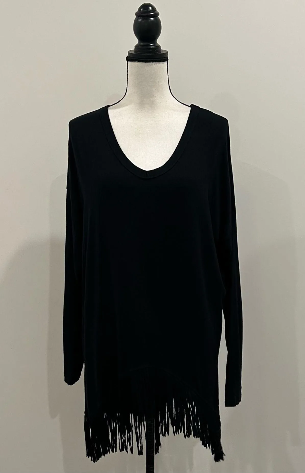Karen by Karen Kane fringe top- black. V-neck. Long sleeves. Soft. High-low style. Fringed bottom. S... Show more