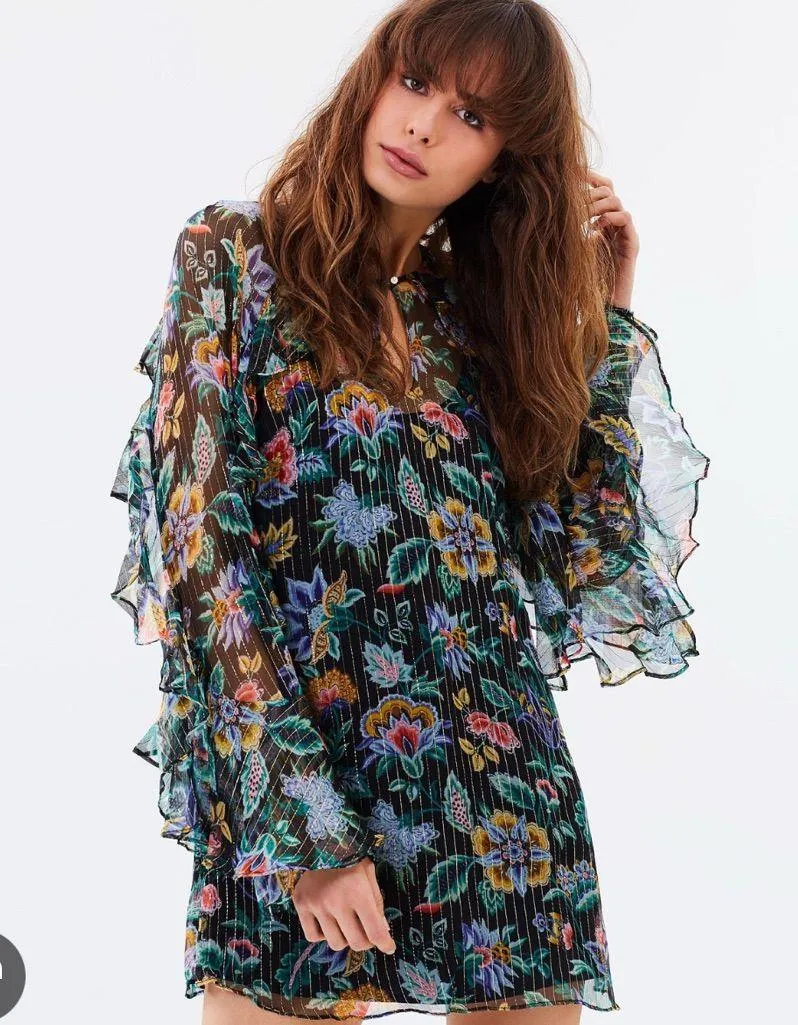 New with tags Size 6 Length: 78cm (size AU 8) - Loose fit - Gauzy silk chiffon outer; sheer; opaque satin built-in slip lining - Black base; green-based garden print; metallic gold thread throughout - Round neckline; buttoned keyhole front with silver-toned button - Long raglan sleeves; cascading frill trim - Slip-on entry