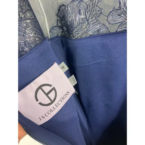 JS Collections Fleur Beaded Column Gown Blue JS Collection’s Fleur column gown crafted with scuba crepe material, floral beading on sheer mesh yoke and elbow flutter sleeves. Bateau neckline Flutter sleeve Slim silhouette High stretch Invisible zip at back Fully lined Beaded