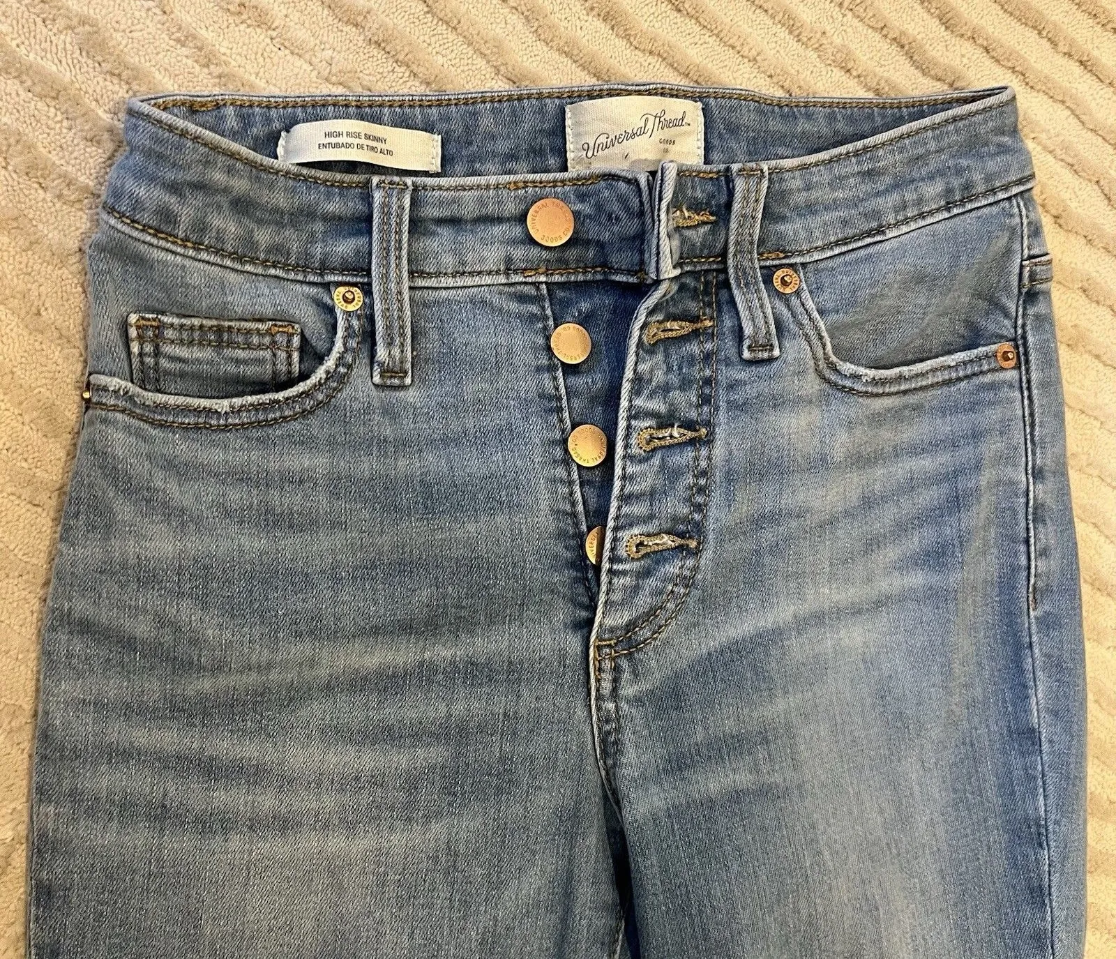 Medium wash. universal thread high rise distressed skinny button fly jeans size 0/25R. Very good use... Show more