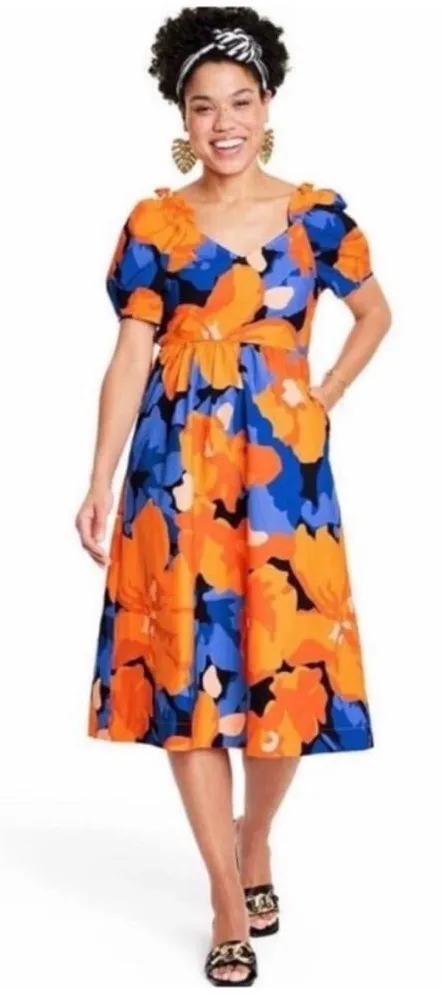 Brand: Tabitha Brown for Target Size: 4 Color: Orange, Blue and Black Style: Midi Dress Features: Puff Sleeve, Sweetheart neckline, Pockets, Back Tie Material: 100% Cotton (20% Recycled Cotton) Excellent pre-owned condition - no flaws found Measurements laying flat: Pit - Pit: 15" Waist: 22" (elastic) Stretches to about 30" Shoulder - Hem: 47" Backside down middle: 30" (Waist Down)