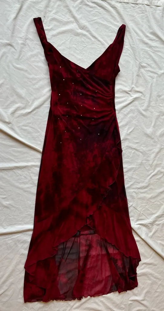 Beautiful vintage red dress with a unique design and a beautiful color. ♡ size: large ♡ brand: Taboo description ♡ red tye dye cinch ruffle maxi dress ♡ color: red, cherry, plum, burgundy, brown, black, wine ♡ deep v neckline ♡ red and deep brown tye dye tie die design ♡ thick tank top ♡ rhinestone designs across bodice ♡ ruffle trim across bottom ♡ asymmetrical hem ♡ gives lana del ray energy ♡ knotted detail on strap ♡ mesh overlay ♡ double lined ♡ asymmetrical maxi dress ♡ bead sequin stud beaded studded embellished detail ♡ y2k mermaid fairy core early 2000’s era piece ♡ viral on pinterest ♡ Perfect for festivals like coachella, rave, & concerts #bead #sequin #ruffle #mesh #lace