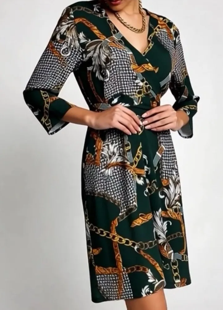 • Elevate your wardrobe with this stunning Tacera wrap dress in size XL • Features a bold emerald green base with intricate gold chain-link motifs and ornate baroque flourishes for a luxurious, equestrian-inspired vibe • Crafted from a soft, flowing fabric with subtle houndstooth accents • V-neck silhouette drapes beautifully with 3/4 sleeves • Includes a self-tie waist belt for flattering definition • Knee-length hem sways with every step, perfect for date nights, office chic, or effortless weekend style • Measures 21" across the bust for a roomy yet tailored fit • Gently pre-loved and ready to make a statement • Pair with gold hoops and heels for that head-turning glow • Tacera's signature quality shines through in every detail—timeless elegance meets modern edge!