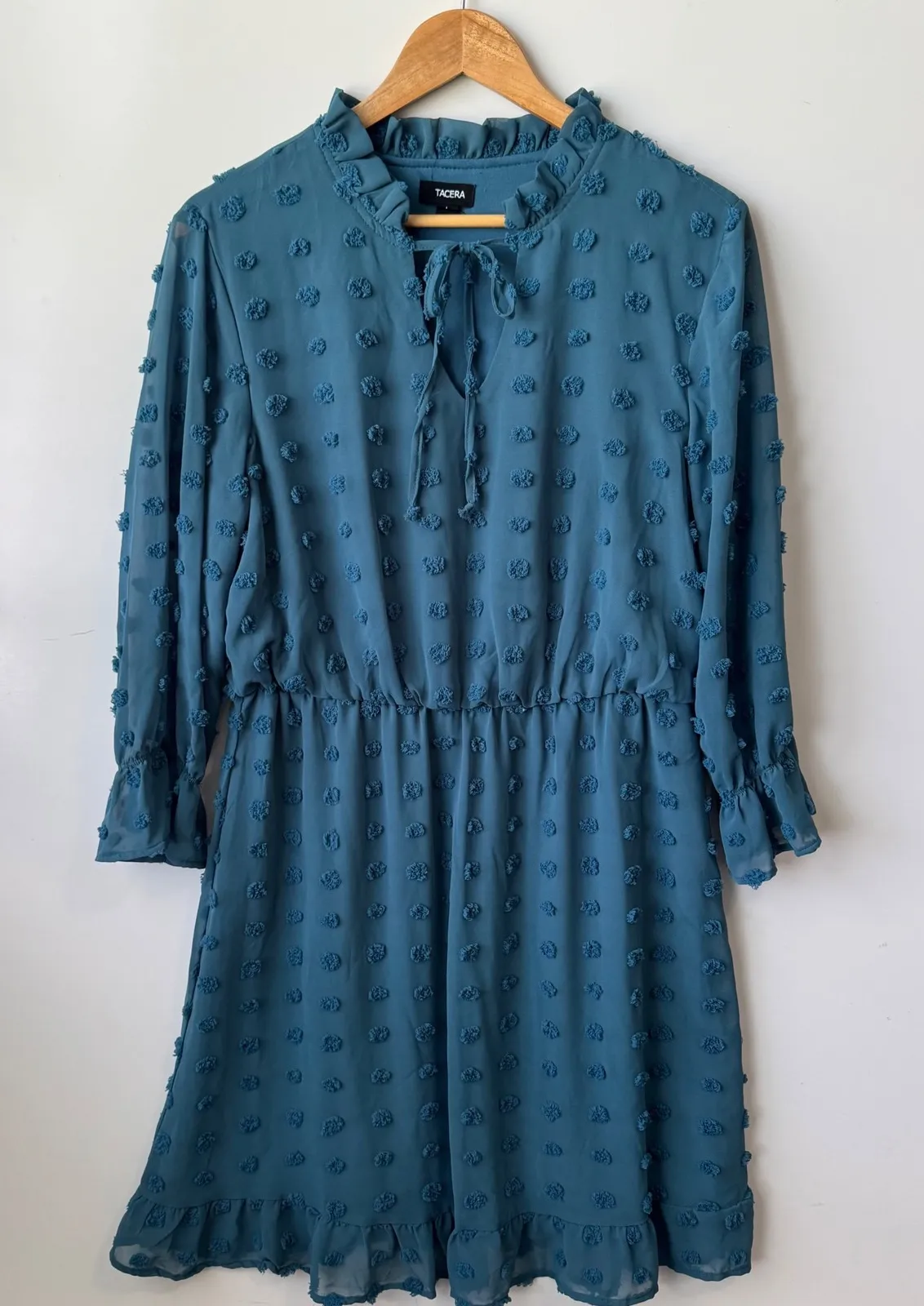 Chic and stylish mini dress featuring a unique pom dot design. This dress showcases a flattering silhouette with its cinched elastic waist and playful ruffle details at the neck and hem. The long sleeves add a touch of elegance, while the teal blue color offers a refreshing and versatile look. The dress also features a tie neckline. Gently used in excellent condition Approximately measurements Chest 22" Waist 17" Length 39" Keywords: Tacera, mini dress, ruffle neck, long sleeve, pom dot, teal blue, boho, bohemian, casual dress, women's dress, dress, elastic waist, tie neck, ruffle hem