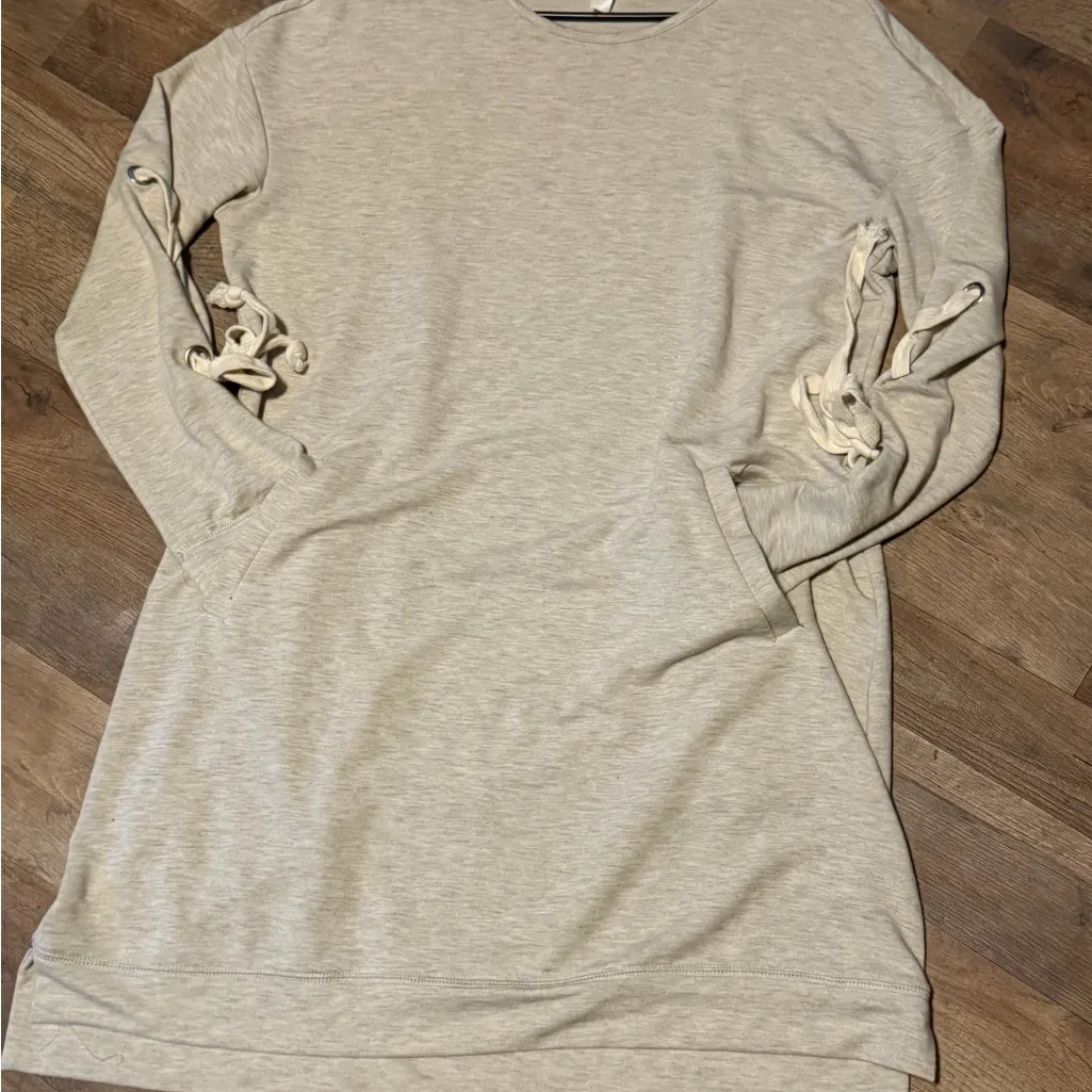Stylish gray long sleeve dress featuring unique tie details on the sleeves. Perfect for casual outings. Tacera heathered, long-sleeved tunic-style dress. Color and Material: The garment is an oatmeal color with a heathered texture, a soft, possibly cotton or blend, fabric. Style and Fit: It is a loose-fitting, casual tunic or short dress with a round neckline. Features: Pockets: There are two large front pockets, likely a single kangaroo-style pocket with two openings. Sleeves: The long sleeves feature a unique design element: drawstrings or ties on the outer lower arm area, creating a ruched or gathered effect. Hemline: The hemline layered or have a subtle high-low design. Size Large in Excellent condition