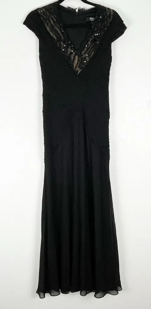 TADASHI Collection 100% Silk Black V-Neck Sequin Eyelet Trim Cap Sleeves Long Concealed Back Zipper... Show more
