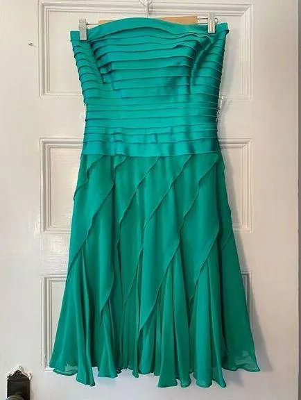 Gorgeous strapless dress with a fit and flare silhouette Tiered, anti-slip bust, made of polyester Ruffled flowy skirt made of 100% silk Back zipper closure Size: 6 Color(s): Jade - green/blue Condition: New with tags from Lord & Taylor A-line, prom, party, special occasion, celebration, graduation, evening, spring, summer, Y2K, designer, Tadashi Shoji Next-day shipping Questions? Leave a comment below!