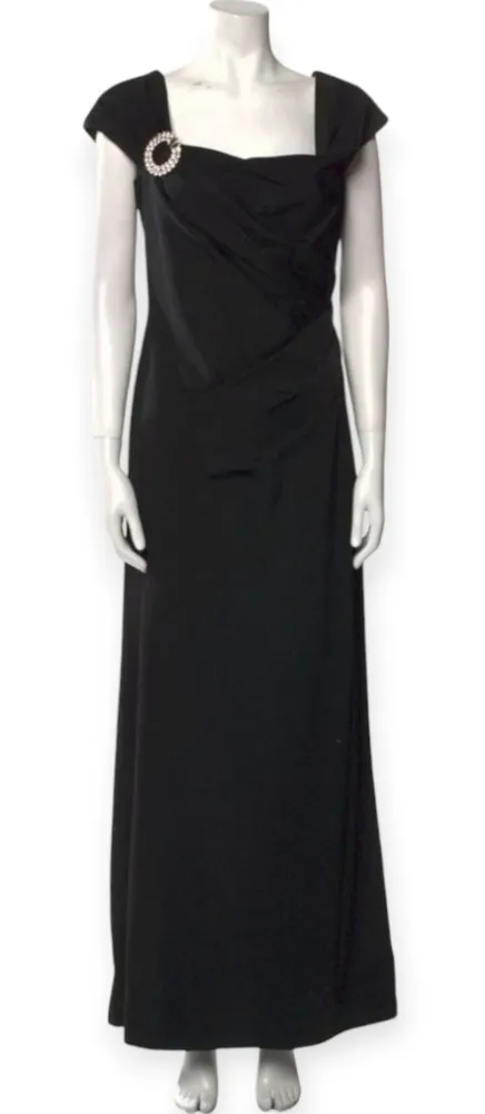 Size 10 black Tadashi Sohji square neckline floor-length evening gown This stunning long black dress has figure-flattering pleater gathering and short cap sleeves that can probably be worn off the shoulders. There is an removable round crystal-embellished brooch for a pop of glitz and glam. This gown has a hidden zipper in the back. This formal gown would be perfect for a mother of the bride or mother of the groom dress. It is fabulous for any formal occasion. wedding guest, ball, gala, military ball, pageant dress, formal black dress, flattering evening gown, Tadashi Sohji sale, on sale Tadashi Sohji, long black evening gown, floor length dress