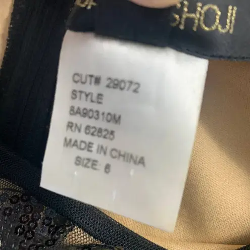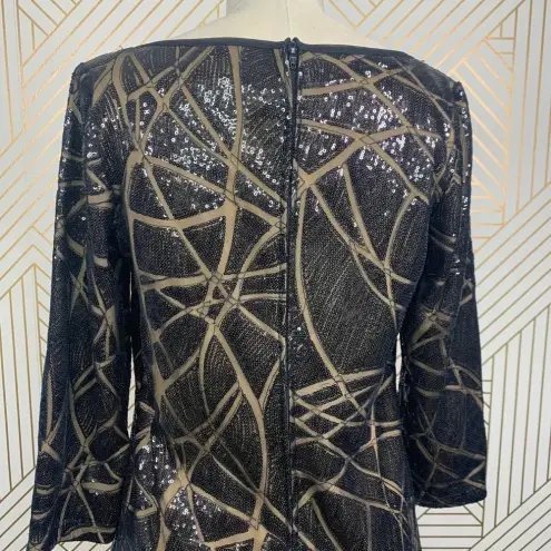 Tadashi Shoji Sequin Tunic Mini Dress in Black & Tan. Boat neck Shift style 3/4 sleeves Sequin line design Mini Black with nude lining Zipper back Size US 6 100% polyester Armpit to armpit is approx 17” Waist is approx 15.5” Hip is approx 19” Length is approx 34”