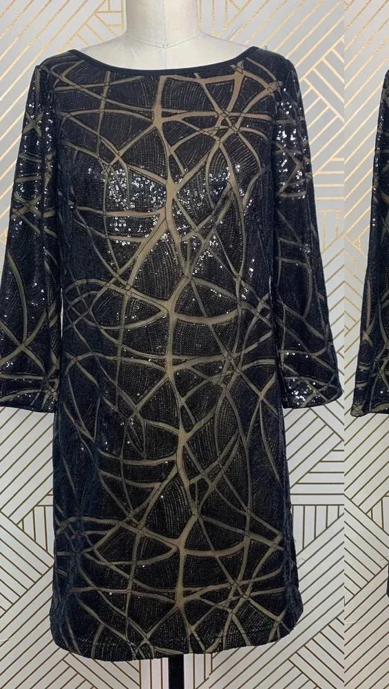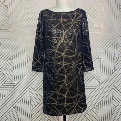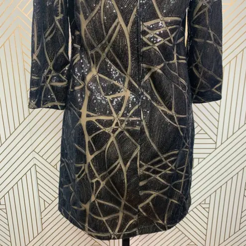 Tadashi Shoji Sequin Tunic Mini Dress in Black & Tan. Boat neck Shift style 3/4 sleeves Sequin line... Show more