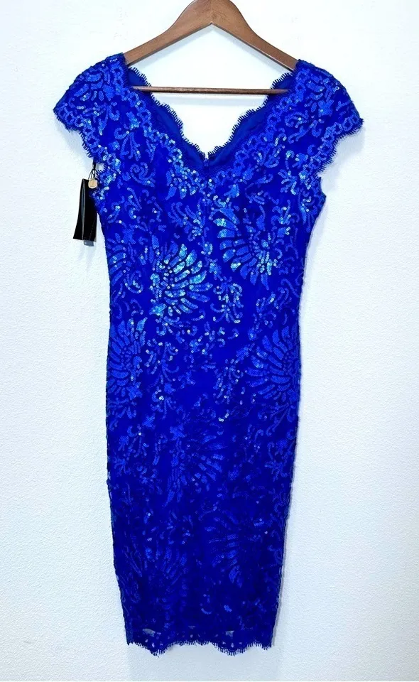 Tadashi Shoji Bright Cobalt Blue Embroidered Lace V Neck Sequin Cap Sleeve Brand New with Tags - Siz... Show more