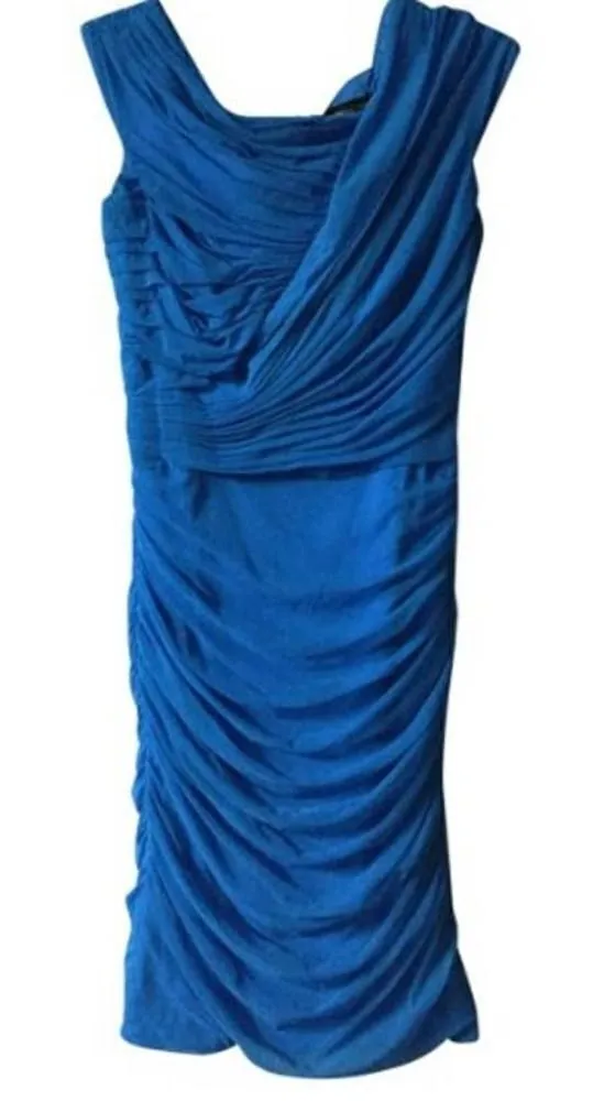 Tadashi Shoji Fern Style Royal Dress NWT Sz. M Retail $268 Approximate Measurements: 38"L, 18" p/p, 14" waist (flat---has stretch) No surprises from the flattering ruched silhouette, but this Tadashi Shoji dress stays forward-thinking with an inviting blue hue. Beautiful and stylish for any occasion, from a wedding to a night out, this dress is sure to make you look stunning. Pair with silver, gold, or black shoes for an exquisite look. Fern blue ruched jersey. Asymmetric neckline. Cap sleeves. Fitted silhouette. Hem hits above knee. Back zip. Nylon/spandex; polyester lining; dry clean only.