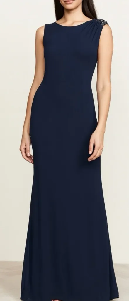 Full Length Embellished Shoulder Open Back Gown in Navy Blue by Tadashi Shoji. Beautiful draping with a floaty gauze outer layer for just the right amount of movement. Stunning crossed open back detail. Gathered embellished, beaded shoulder. Super elegant and flattering. Sleeveless. Size 10. Great preowned condition. Side zip with hook and eye closure. Style tags: formal, mother of the bride, MOB, wedding guest, black tie, beaded, sparkly, solid, neutral, maxi, quiet luxury, fall, winter, cocktail, holiday, Christmas, New Years Eve, minimalist, feminine.