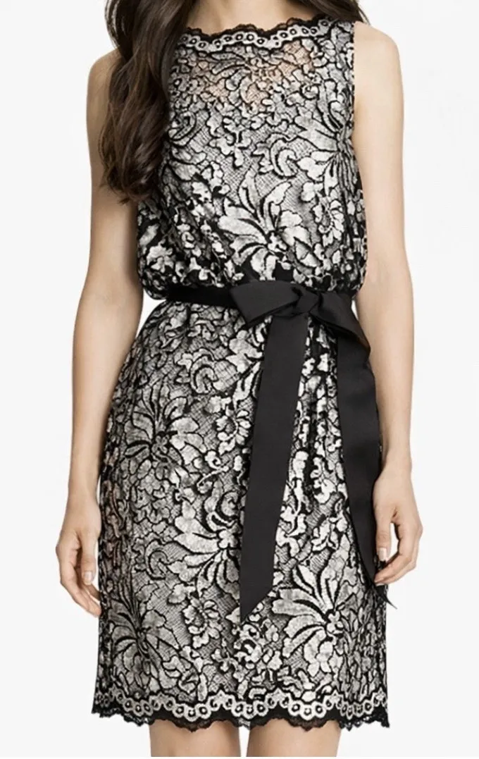 Black lace embellished with matte silver sequins over silver gray satin. Jewel neck, back zip, black grosgrain ribbon belt, fully lined. Lace open at back to create blouson effect. Scalloped hem. 40% nylon, 30% cotton, 30% polyester Lining: 100% polyester Dry clean only Zip closure in back New with tags, no flaws Approximate measurements laying flat: 17" armpit to armpit 39" length Colors may slightly vary depending on lighting & screen settings Clean, smoke free, pet free environment Same day or next day shipping Offers welcome and will be considered