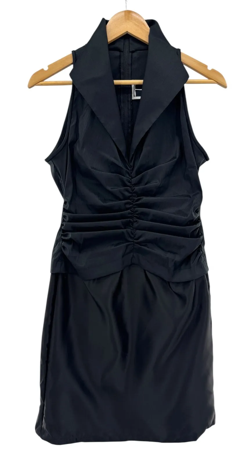 Elegant vintage Tadashi black sleeveless ruched dress featuring a structured halter collar neckline, gathered front bodice, and satin skirt contrast. A striking minimalist silhouette that's both timeless and sophisticated — ideal for cocktail parties, semi-formal events, or Y2K-era fashion lovers. Brand: Tadashi Size: 8 (UK 10) Measurements: Length 37″ | Pit to Pit 17″ Fabric: 62% Rayon | 32% Polyester | 6% Lycra (Contrast 100% Poly) Care: Dry clean only | Dry iron no steam Made in USA Condition: Pre-owned, excellent vintage condition with minimal signs of wear. Style + Keywords ruched mini dress, black cocktail dress, little black dress, vintage Tadashi, 90s evening wear, Y2K style, minimalist glam, halter neck dress, satin contrast, holiday party dress, Made in USA designer