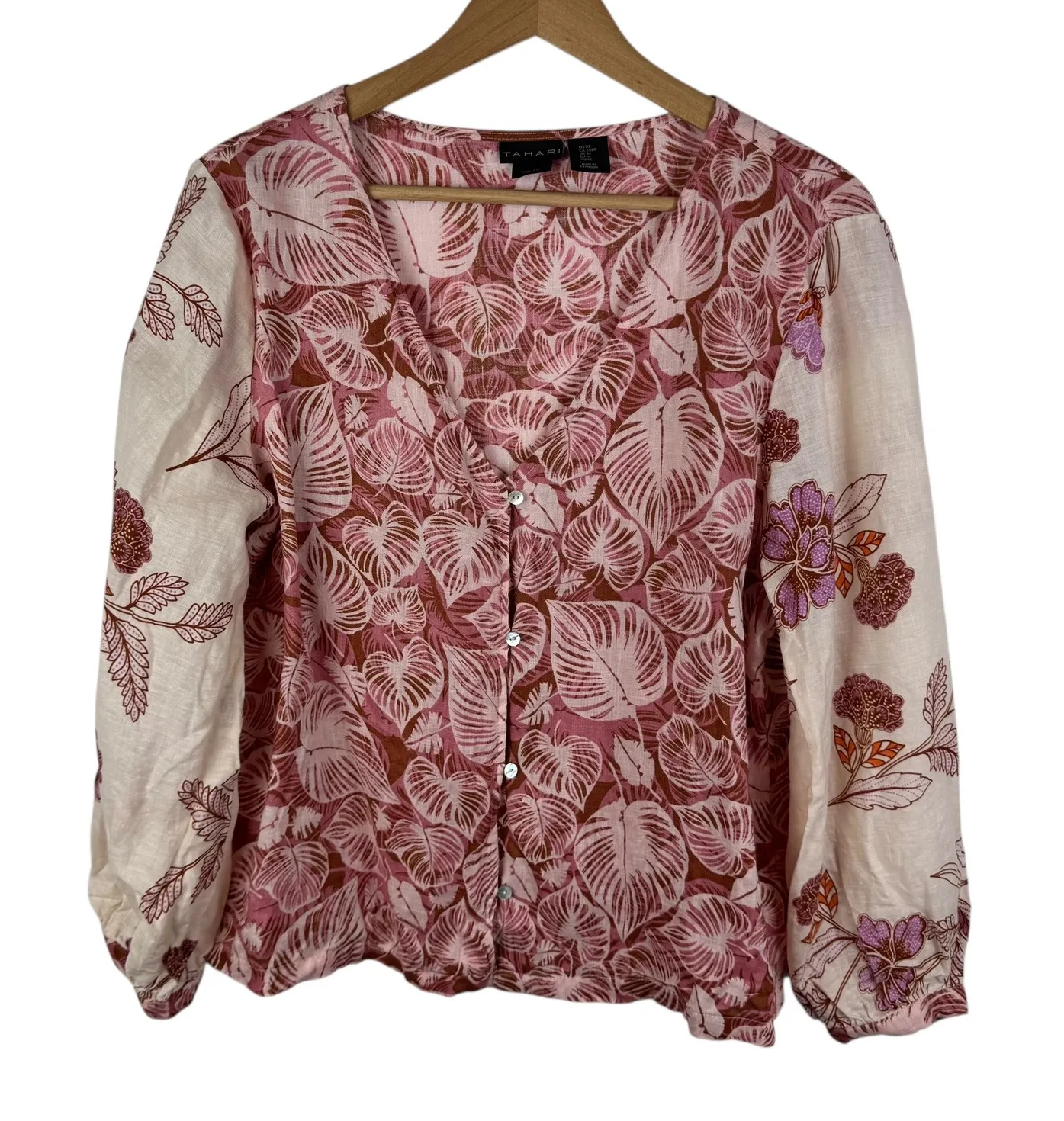 Elegant button-down blouse with a captivating floral and botanical print that combines shades of pink, brown, and ivory. The design features a unique contrast between the patterned body and solid, floral-accented sleeves, creating a bohemian yet sophisticated look. Mother-of-pearl buttons add a touch of understated luxury. This blouse is ideal for a garden party, a casual brunch, or a day out exploring local shops. Color: Pink Type: Blouse Department: Women Style: Tunic Material: Linen Neckline: V-Neck Sleeve Length: Long Sleeve Sleeve Type: Classic/Fitted Sleeve Accents: Button Pattern: Floral Features: Lightweight, Breathable, Collarless Character: Bohemian Fit: Regular Keywords: Tahari blouse, linen blouse, floral print blouse, botanical print, pink blouse, brown blouse, bohemian blouse, womens blouse, button down blouse, long sleeve blouse, casual blouse, boho top, linen top, Lightweight, Cottagecore Blouse, Boho Top, Vacation, Spring Style, Boho Chic, Eco Friendly, Layering Piece Excellent Pre-Owned Condition (see pics for details) Flaws: No visible flaws. Measurements: included in photos. Please compare the measurements to something you already own for a great fit! Fast shipping: Shipped out next business day! Please let us know if you have any questions!