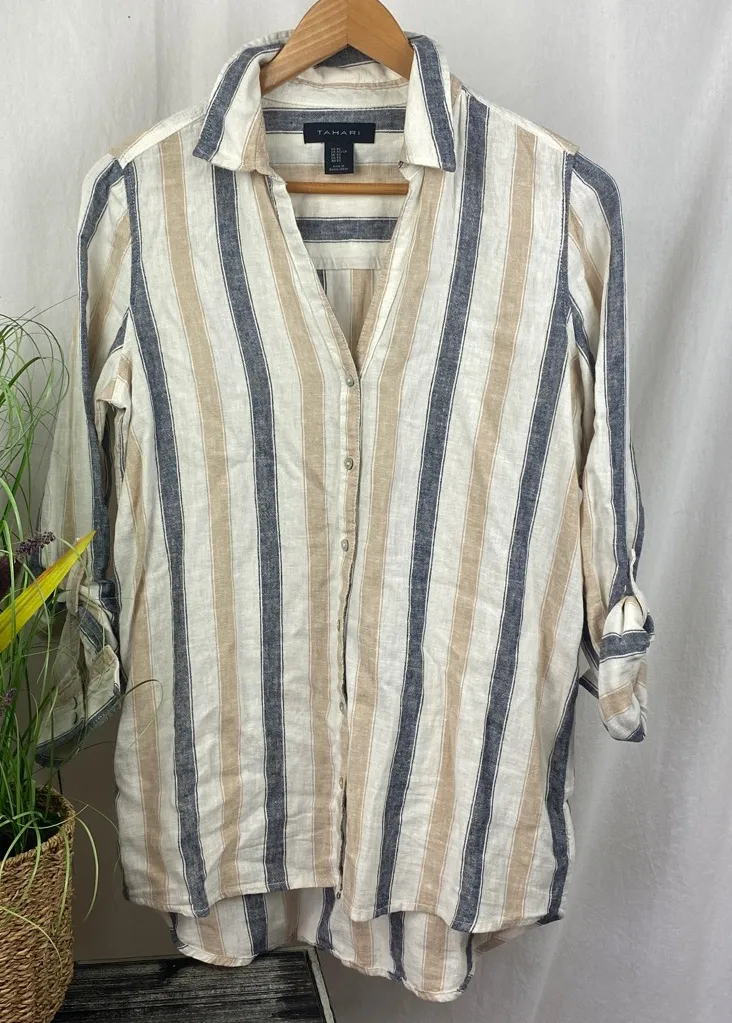 Tahari 100% Linen Tan Gray Cream Button Long Sleeve Tunic Top XS - $30 - From Designer