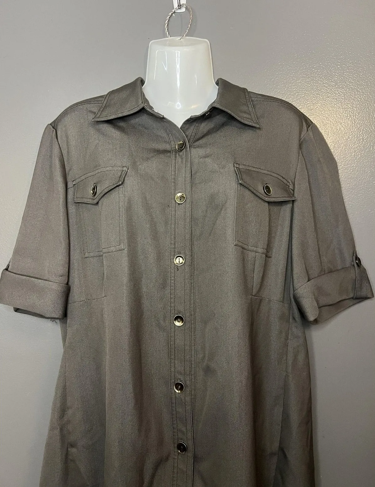 Pre-owned dress in clean condition with fabric intact and buttons secure. Light wrinkling throughout from storage, no stains, holes, or snags. No original tags included. Brand: Tahari Arthur S. Levine Style: Womens woven button front shirt dress with collared neckline and knee length hem. Color: Solid gray. Size: Tag size 14, regular fit. Details: Half sleeves with roll-tab cuffs, full front button placket, two chest flap pockets with buttons, straight silhouette with seaming for subtle shaping, unlined. Made in China. PTP 22 Length 38 Bin 64 2551