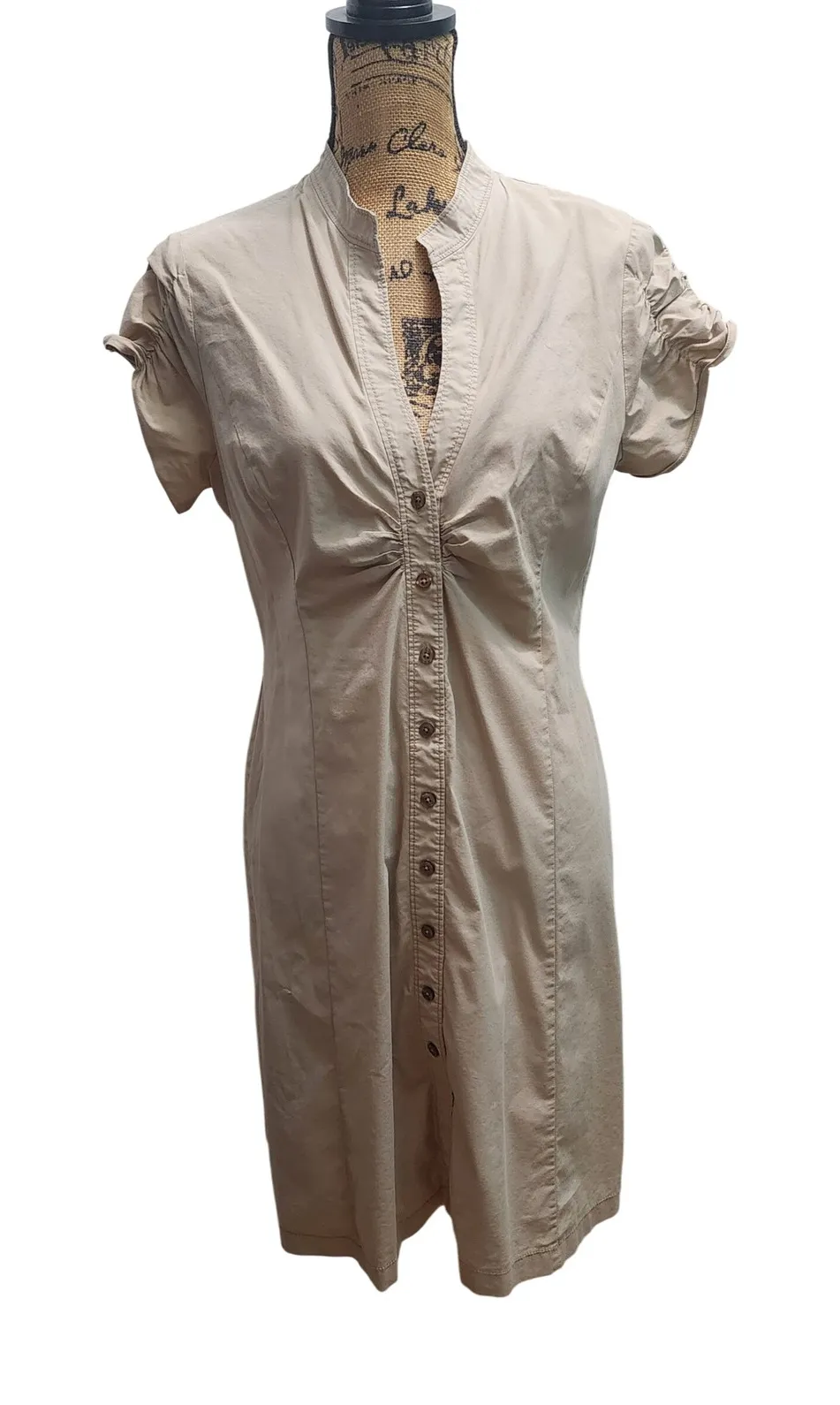 A chic Tahari beige tan shirtdress designed for effortless style. This button-front dress features a flattering V-neckline with delicate ruching at the bust, enhancing the silhouette. Short sleeves with gathered detailing add a touch of feminine flair. Measurements: • Shoulder to Shoulder: 15 in • Bust: 18 in • Waist: 15 in • Hips: 18 in • Length: 38 in • Sleeve Length: 7 in Style: Shirt Dress Dress Length: Knee Length Department: Women Sleeve Length: Short Sleeve Pattern: Solid Occasion: Casual, Business, Workwear Material: Cotton, Elastane, Polyamide Fabric Type: Woven Theme: Classic, Designer Neckline: V-Neck Season: Spring, Summer Sleeve Type: Cap Sleeve Closure: Button Keywords: Tahari dress, Shirtdress, Button front dress, Tan dress, Beige dress, Ruched dress, Short sleeve dress, Womens dress, Casual dress, Office dress, Knee length dress, Summer dress, Spring dress