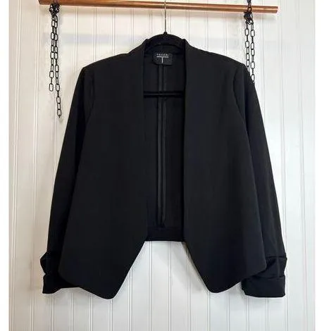 Solid Black Open Front Long Sleeves with Ruched Cuffs Asymmetrical Hemline Polyester & Spandex Blend Size Medium Measurements - See Pictures For Details - Excellent Condition - Smoke-free/pet-free House - Fast Shipper Tags: Corporate, Corp, Corpcore, Girlboss, Wmns, Career, classic, staple, office, workwear, business causal, dinner, Professional, Business, Classy, Elegant, Modest, work, business attire, designer, preppy, academia, chic, stylish, trendy, pocket, college, school, casual