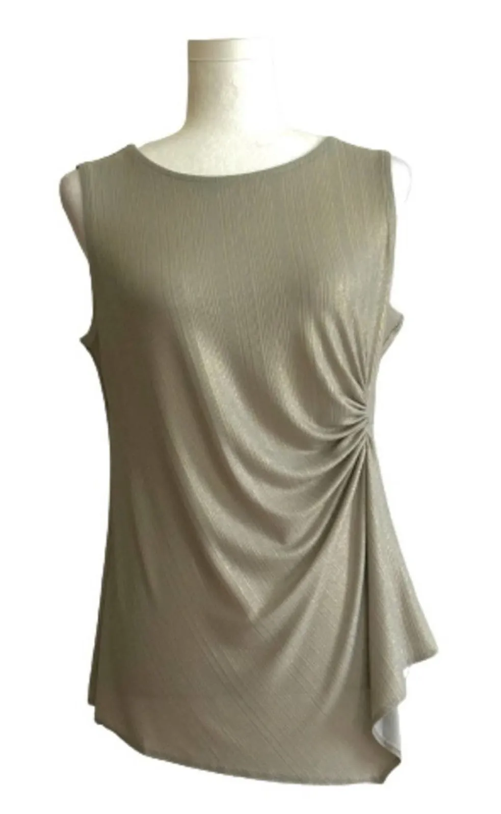 Tahari Taupe Green Gold Shimmer Sleeveless Side Ruched Asymmetric Hem Blouse Top Size XS NWT This s... Show more