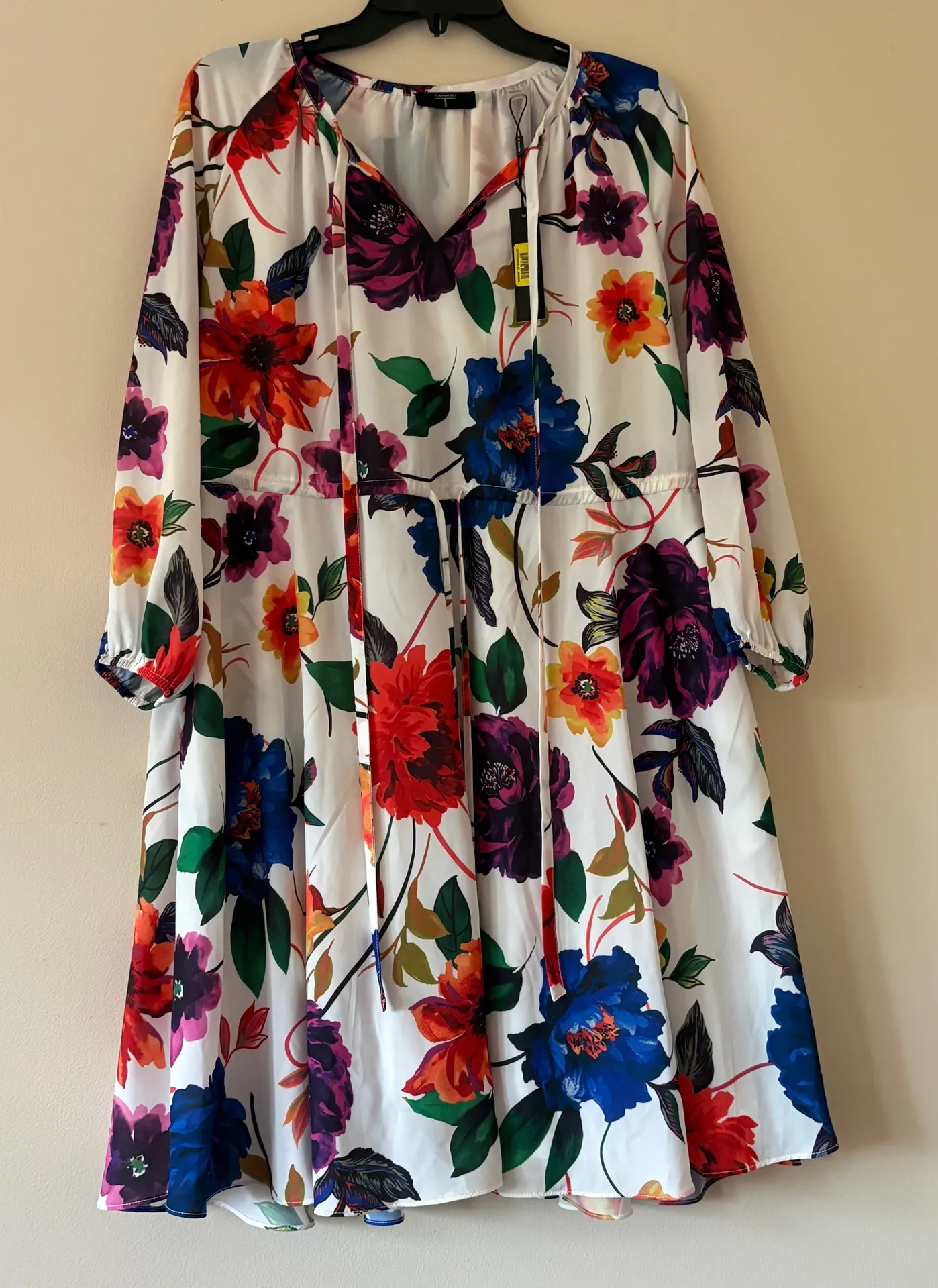 Absolutely stunning Tahari “Multi Rainbow Floral” midi dress, new with tags ($118 retail). Features bold, painterly floral blooms in jewel tones on a white background. Designed with a flattering empire waist, long blouson sleeves, and flowy, lined skirt that moves beautifully. Perfect for weddings, garden parties, or spring events. ⸻ Details • Brand: Tahari • Size: 10 • Color: White base with multicolor floral print • Material: 100% polyester shell and lining • Style: Midi dress • Sleeve: Long balloon sleeves with elastic cuffs • Neckline: Split V-neck • Lining: Fully lined • Condition: NWT (New With Tags) — Original retail $118 • Made in China ⸻ Estimated Flat Measurements • Bust: ~19.5” • Waist: ~16.5” • Length: ~40” (Measurements taken flat, approximate.) ⸻ Condition Brand new with tags. No flaws noted.