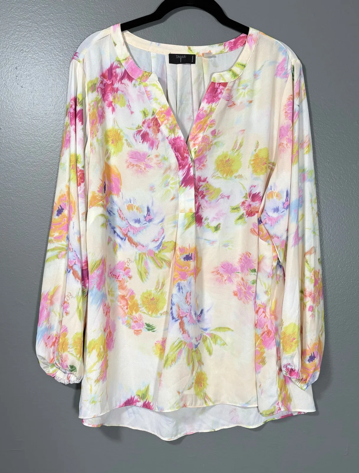 Women's plus size romantic coquette top by Tahari. This pale yellow top has a pastel watercolor style floral print, long sleeves, and a v-neck. It is 100% polyester. The top is a size 1X. When laying flat it measures approximately: Armpit to armpit: 26 inches Length: 29 inches The top is in amazing shape.