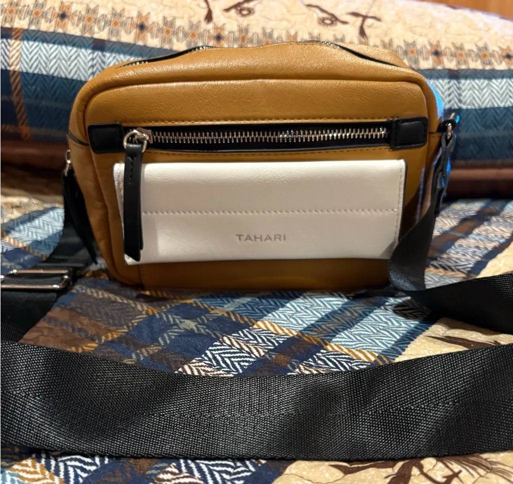 This Tahari camera bag, specifically a style known for its compact, structured shape with a top-zip closure and a front pocket, often featuring a contrasting color or texture, like the white panel on the brown bag. The brand Tahari offers various camera bag styles under different lines. GUC Thanks for looking!