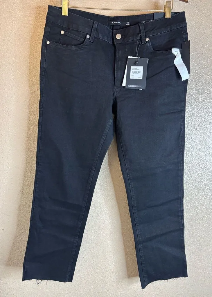 Elevate your denim collection with these Tahari Kelly jeans in timeless black. The mid-rise, slim straight fit flatters your silhouette while the 5-pocket design provides ample storage space for your essentials. The zipper and button closure, accented with a button and zipper, adds a touch of sophistication to the overall look. Crafted from high-quality denim fabric that is both durable and machine washable, these jeans are perfect for everyday wear. The dark wash and solid pattern make them versatile enough to pair with any top, while the accents and features, such as the slimming effect, add a touch of uniqueness. Ideal for women who want to look and feel great in their jeans, this Tahari model is a must-have for any wardrobe.