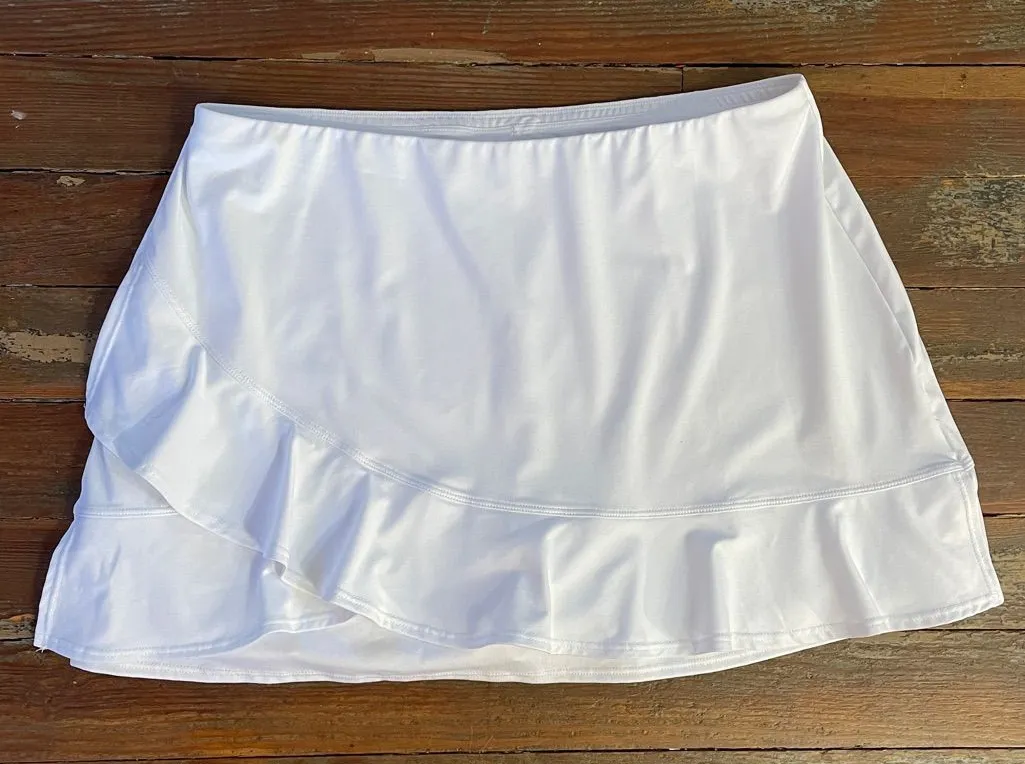 Brighten your court (or your day) in this bright white Tail skort, a perfect blend of sporty performance and feminine flair. Crafted from lightweight, breathable fabric, this skort keeps you cool whether you're smashing aces or running errands. Details: • Flouncy Ruffle flare on the front • Built-in compression shorts with a hidden pocket (perfect for balls, keys, or phone) • Mid-rise, pull-on waistband for a sleek, no-fuss fit Excellent condition. Size large. Measurements are approximate and from laying flat: Waist: 16" Skirt Length: 14” Shorts Inseam: 4” Athletic ~ athleisure ~ sporting events ~ sporty ~ sports ~ weekend ~ Comfortable ~ outdoor ~ tennis ~ golf ~ exercise ~ workout ~ running ~ jogging ~ summer ~ fall ~ winter ~ spring ~ travel ~ lightweight ~ stretchy ~ mesh ~ pleated ~ breathable