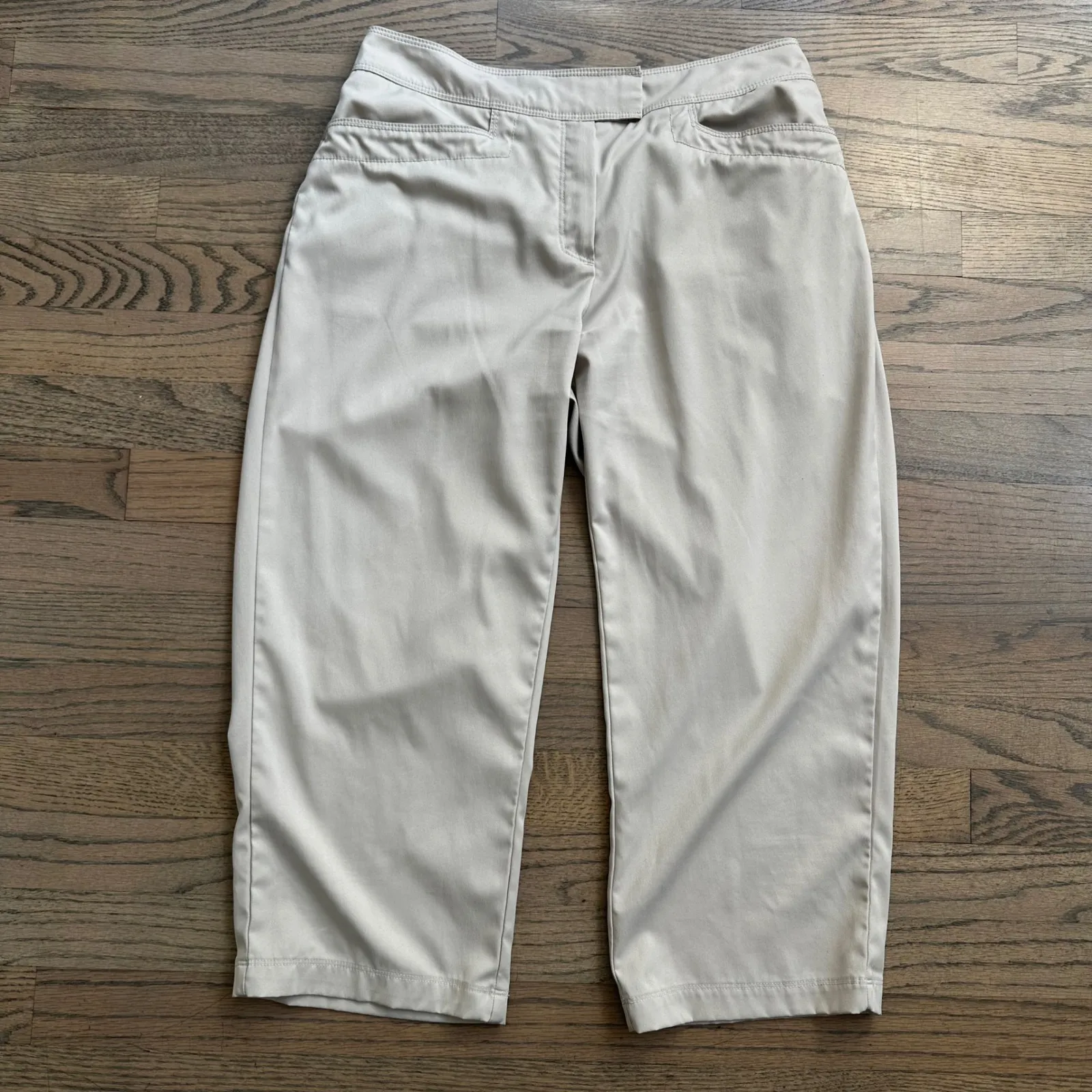 Meet your new favorite everyday essential: these versatile beige cropped pants from Tail. Engineered for comfort and style, these pants offer a sleek silhouette with a modern cropped length. Notice the expertly tailored fit, accentuated by a smooth waistband and subtle pocket detailing, providing a flattering and functional design. The sophisticated beige hue pairs effortlessly with any top, adding polish to your look. Imagine wearing these pants for a casual day at the office, a weekend brunch with friends, or even a round of golf – they're that adaptable. Measurements: • Waist: 14.5 inches • Inseam: 20 inches Color: Beige Style: Cropped Department: Women Type: Pants Performance/Activity: Golf Closure: Button, Zip Material: Polyester, Spandex, Polyester Blend Occasion: Activewear, Casual Waist Size: 25 in Keywords: Tail, cropped pants, beige pants, womens golf pants, athleisure pants, casual pants, stretch pants, size 4, cropped trousers, womens pants, beige crops, golf apparel, activewear, womens activewear, sportswear