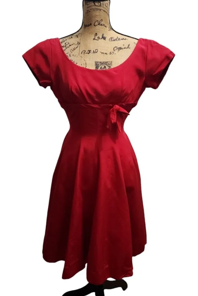 Step into timeless elegance with this stunning vintage-inspired red dress. Perfect for cocktail parties, date nights, or any special occasion where you want to make a statement. The flattering silhouette, complete with a charming bow detail, accentuates your curves while the vibrant red hue ensures all eyes are on you. Channel your inner pin-up girl and dance the night away in this retro-chic masterpiece. 30 inch chest 22 inch waist 37.5 inchea in length Decade: 1950s Style: Fit and Flare Occasion: Cocktail Color: Red Look: Retro All pre-owned clothing has been washed to manufacturer standards. Keywords: red dress, vintage style, retro, pin-up, cocktail dress, bow detail, short sleeve, fitted, flared skirt, zipper back, scoop neck, 1950s inspired, party dress, evening wear, feminine