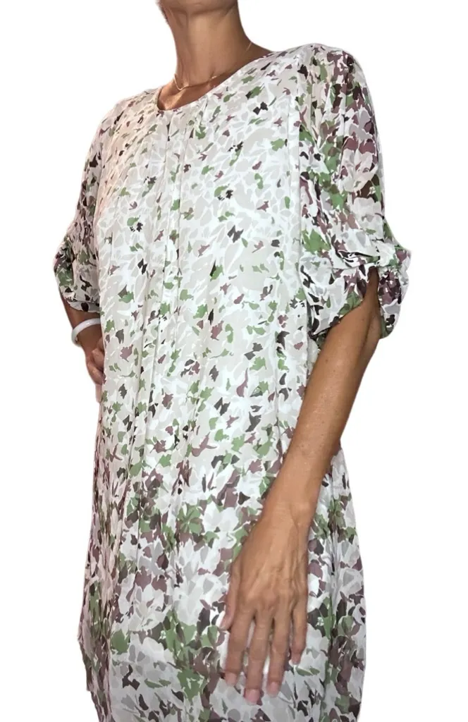 A lightweight chiffon tunic dress with a scattered floral print. This dress features a round neckline with subtle gathering and 3/4 length sleeves that can be rolled and secured. The hemline gracefully transitions to a denser floral pattern, with a smooth lining underneath for comfort and opacity. Ideal for casual outings, brunch, or a relaxed vacation. Approximate Measurements: • Shoulder to shoulder: 16 in • Bust: 20 in • Waist: 22 in • Hips: 23 in • Sleeve length: 16 in • Total length: 35 in Style: Shift, Kaftan Dress Length: Midi Department: Women Sleeve Length: 3/4 Sleeve Pattern: Floral Occasion: Casual, Party/Cocktail Material: 100% Chiffon Fabric Type: Chiffon Theme: Bohemian, Nature, Flower Neckline: Round Neck Season: Spring, Summer, Fall Sleeve Type: Roll Tab Sleeve Closure: Pullover Keywords: takho dress, chiffon dress, floral print, tunic dress, mini dress, 3/4 sleeve, lightweight, lined, casual, brunch, vacation, sheer, boho, feminine