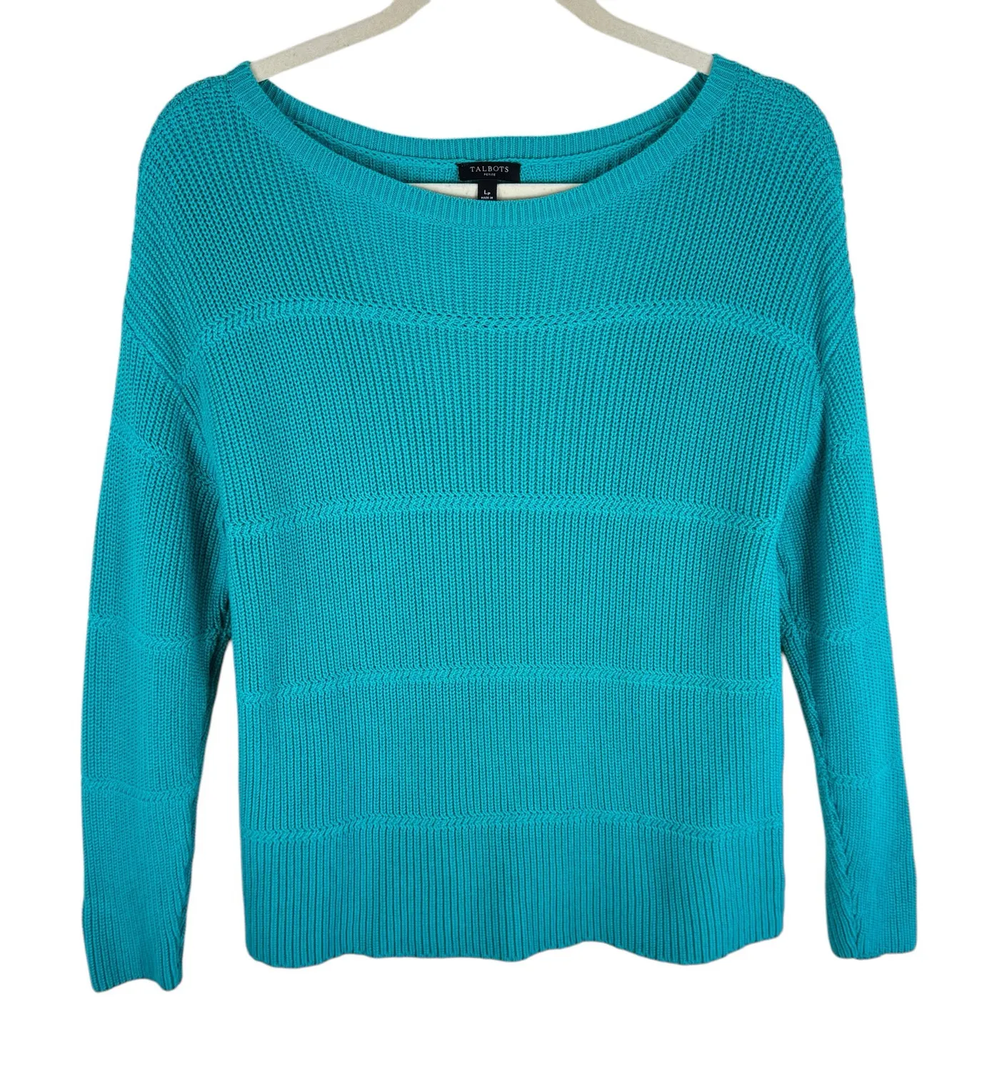 Excellent preowned condition, like new. Blue/green colored long sleeve round neck chunky knit pullov... Show more