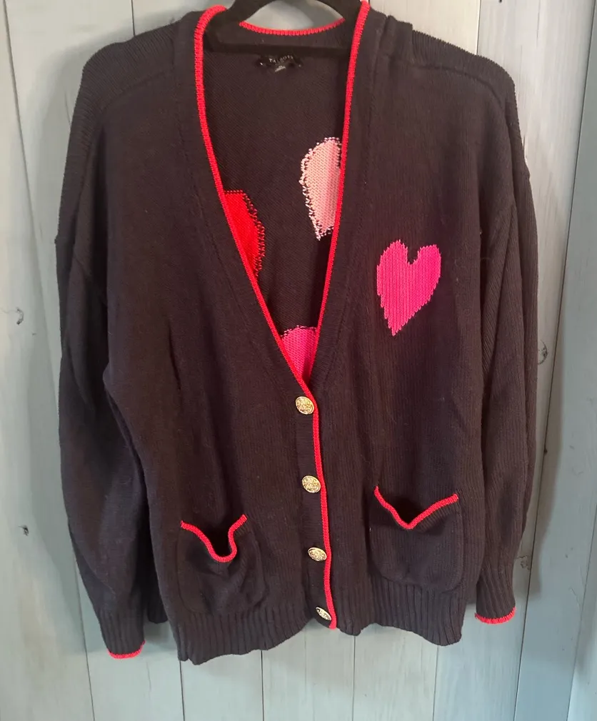 Stylish black cardigan with charming pink heart details. Features button front and pocket trim. Talb... Show more