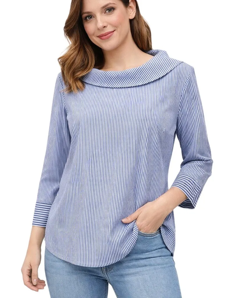 Elevate your everyday wardrobe with this chic Talbots blue and white striped boat neck shirt. The so... Show more