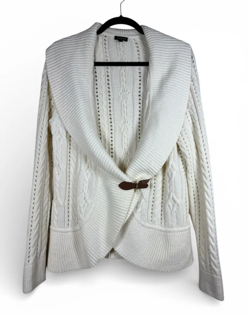 Bueatiful classic cable knit cardigan with a shawl collar and buckle close detail. A perfectly put t... Show more
