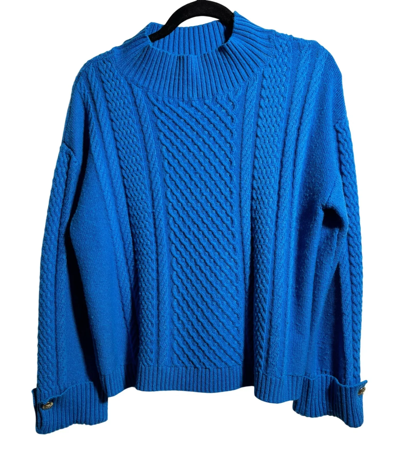 Talbots Cobalt Blue Cable Knit Mock Neck Sweater Womens L Old Money Preppy Gold Buttons Measurement... Show more