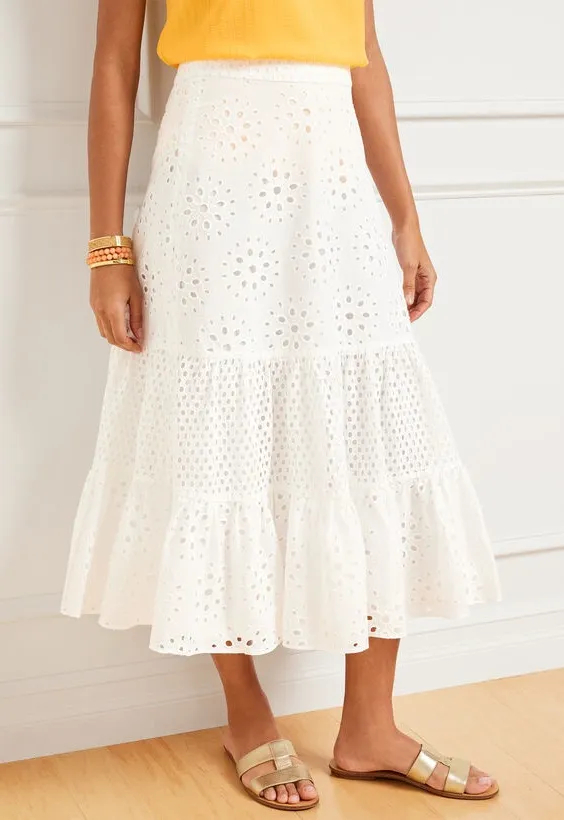 Talbots Eyelet Tiered Midi Skirt White Floral 100% Cotton Sz 12 Side zip closure, lined. One small... Show more