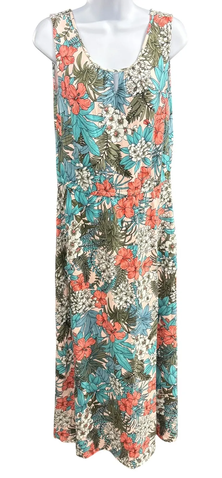 Keywords: maxi dress, floral dress, Talbots dress, tropical print, sleeveless dress, casual dress, cottagecore, bohemian, summer dress, vacation dress, women's fashion, printed dress, round neck dress, small dress