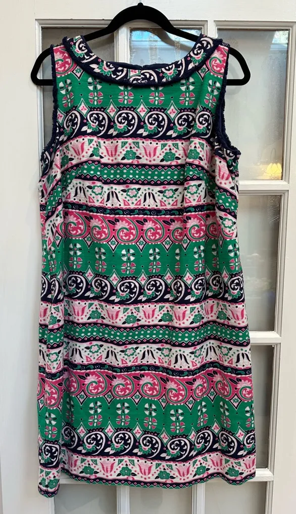 Chic sleeveless dress with vibrant southwestern patterns. Features green, pink, and black hues. Perf... Show more