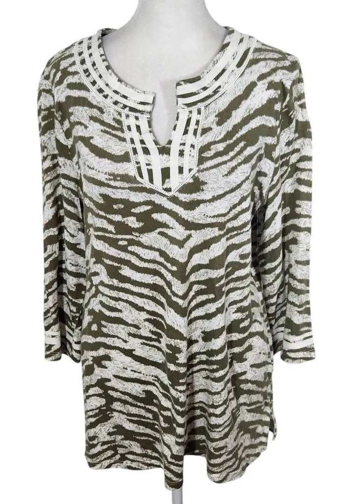 Talbots green and white animal print top with 3/4 sleeves, notches at hem, and ribbon detail. Make m... Show more