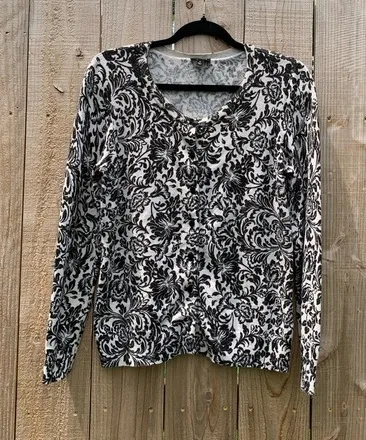 Cream & black floral button up cardigan by Talbots size medium. Preowned great condition. Has gold s... Show more