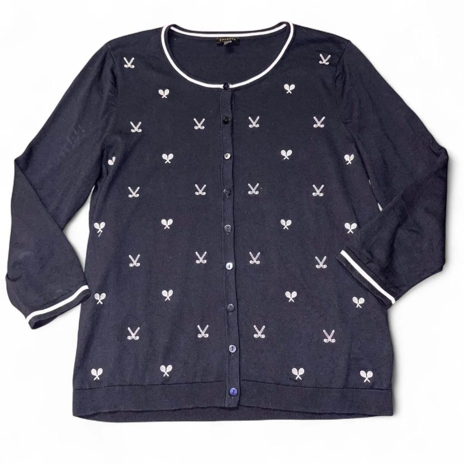 This little knit cardigan is soft and comfy without feeling bulky, and the embroidered tennis and go... Show more