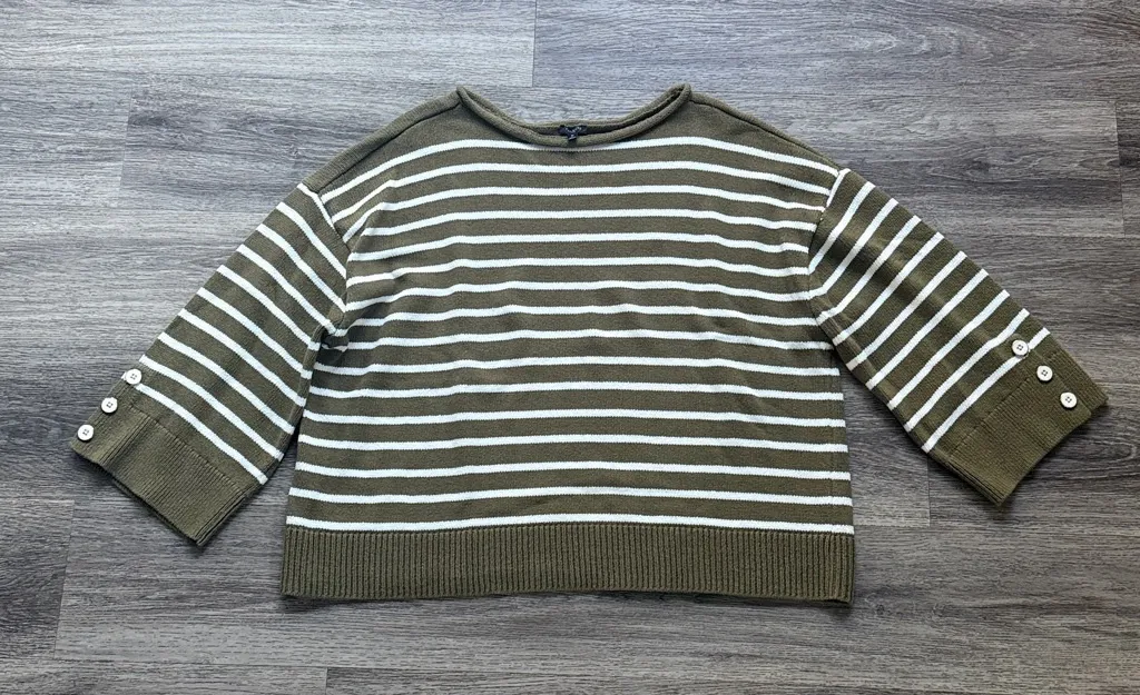 Olive green and white striped sweater. Crew neck design. Button details on sleeves. Great used condi... Show more