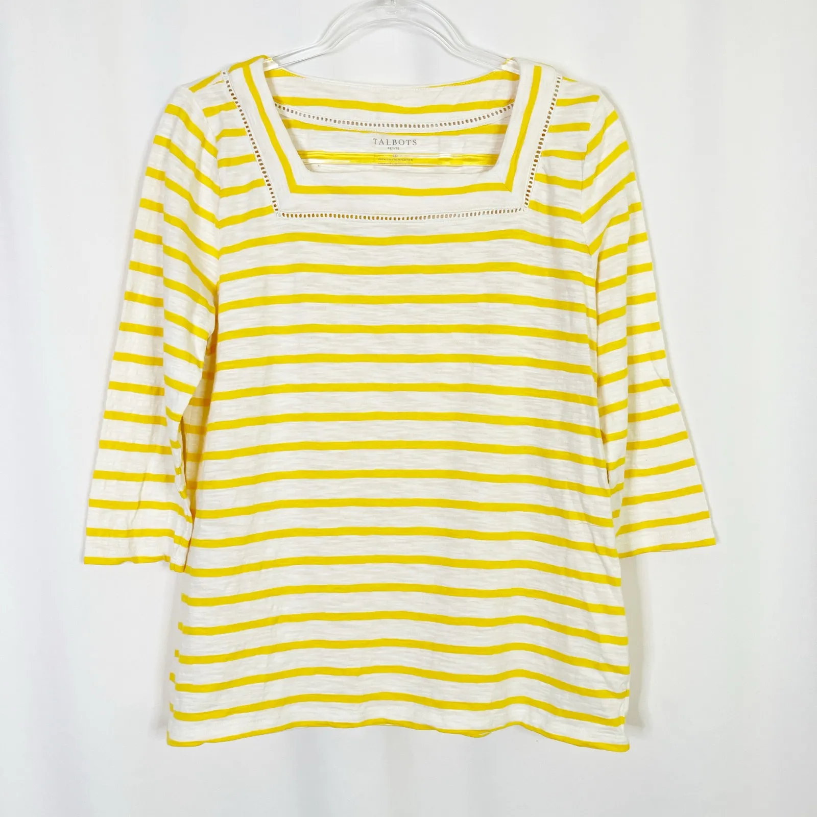 Talbots Yellow stripe Burnout fabric 3/4 sleeve tee Square neckline Size Large PETITE 100% cotton... Show more