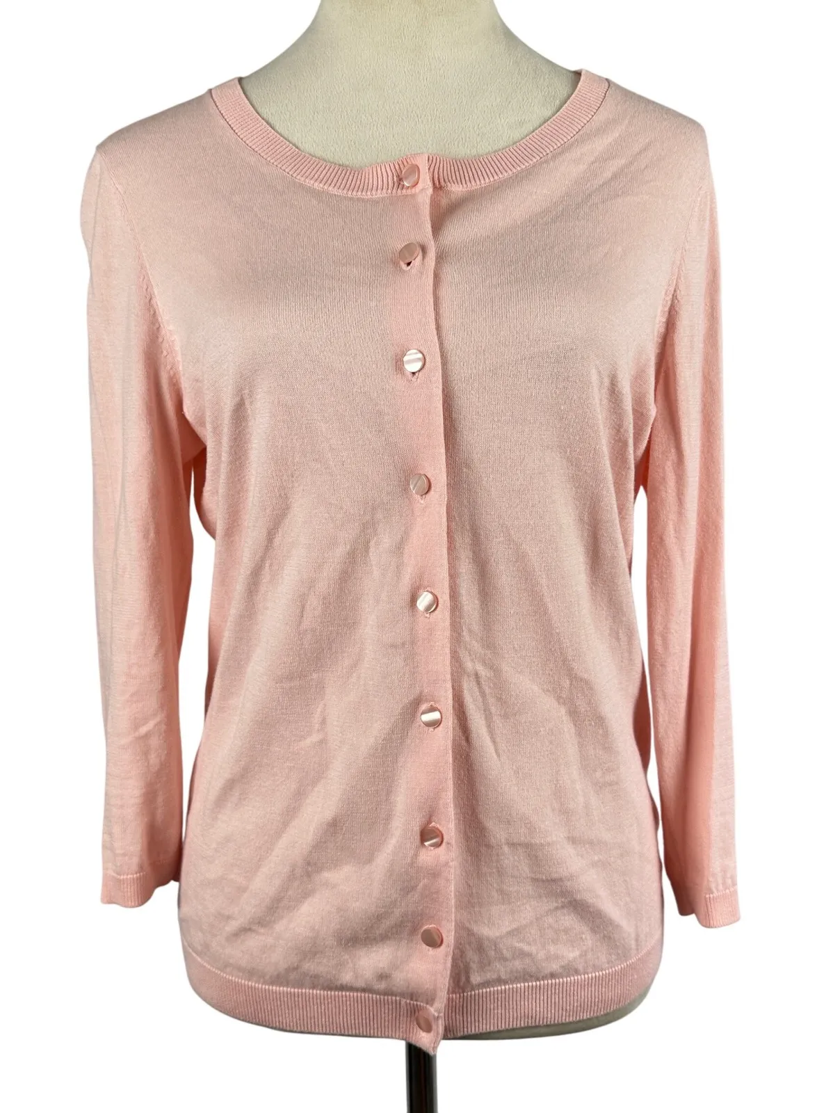 A touch of elegance graces your wardrobe with this lovely pink cardigan sweater. Crafted with a soft... Show more