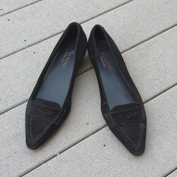 Talbots size 9 black velvet pointed toe loafers. leather upper. excellent condition. .5in heel.