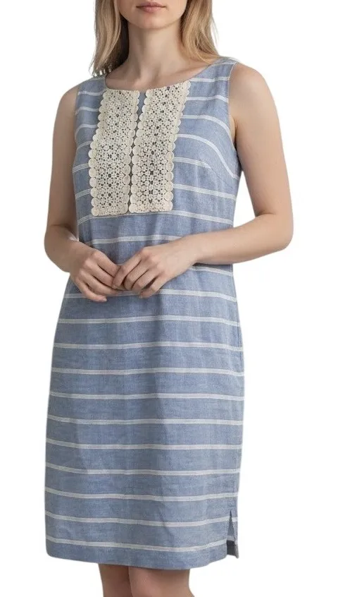 Keywords: striped dress, sleeveless dress, blue dress, white dress, crochet dress, summer dress, casual dress, knee length dress, beach dress, vacation dress, brunch dress, garden party dress, linen dress